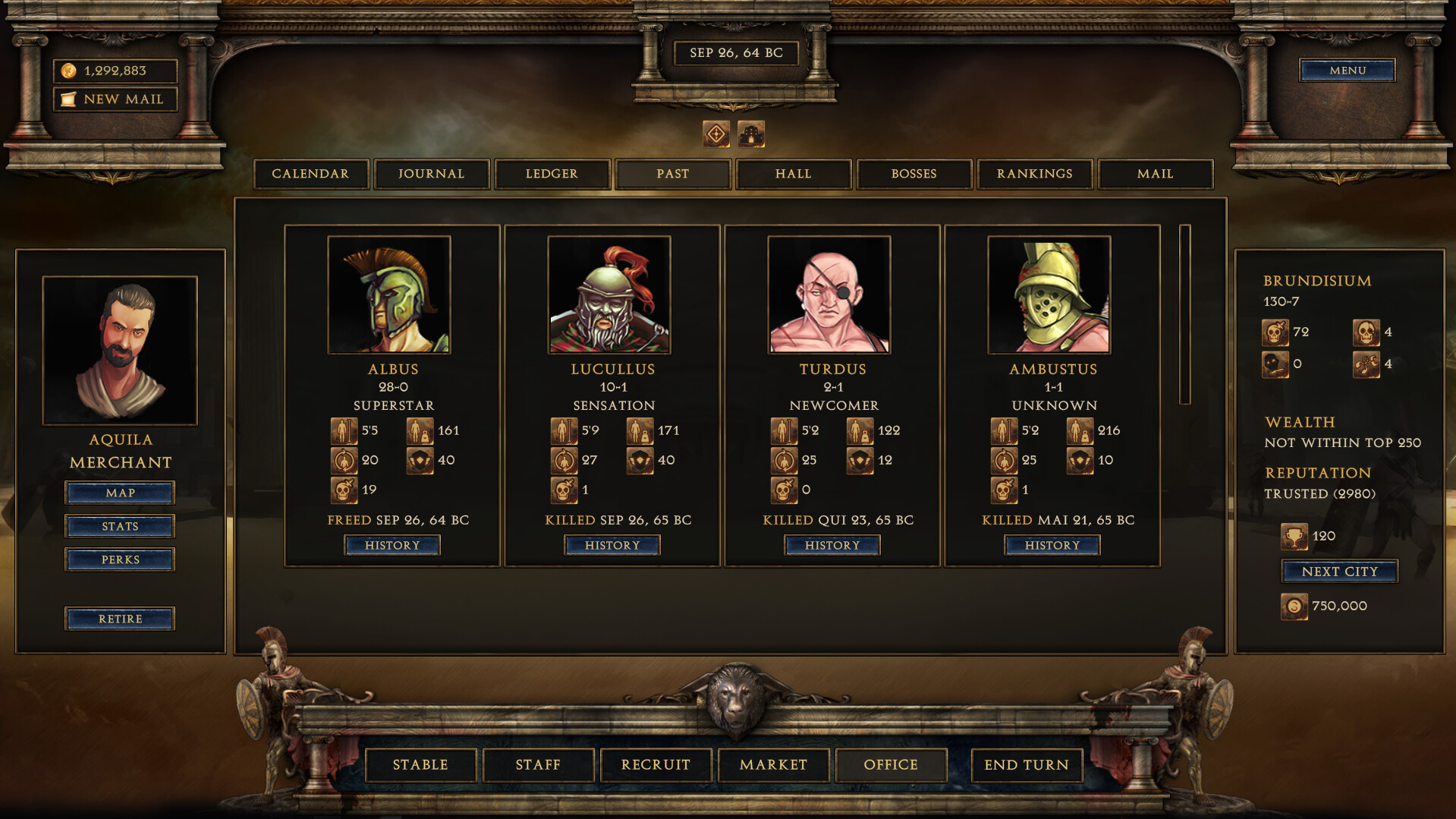 Strive to become the wealthiest individual in the entire Roman republic. There are quick and underhanded ways to make money, but your reputation and fighter’s morale may suffer as a result.