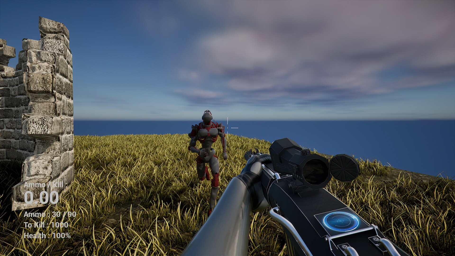 Welcome to our alien weapon service center’s exclusive firing test site, located in an extradimensional domain with authentic ancient ruins. Test your skills with one of our advanced rifles against unarmed but aggressive bots. Your mission is to eliminate all robots while maintaining an ammo-to-kill ratio below 1.5.