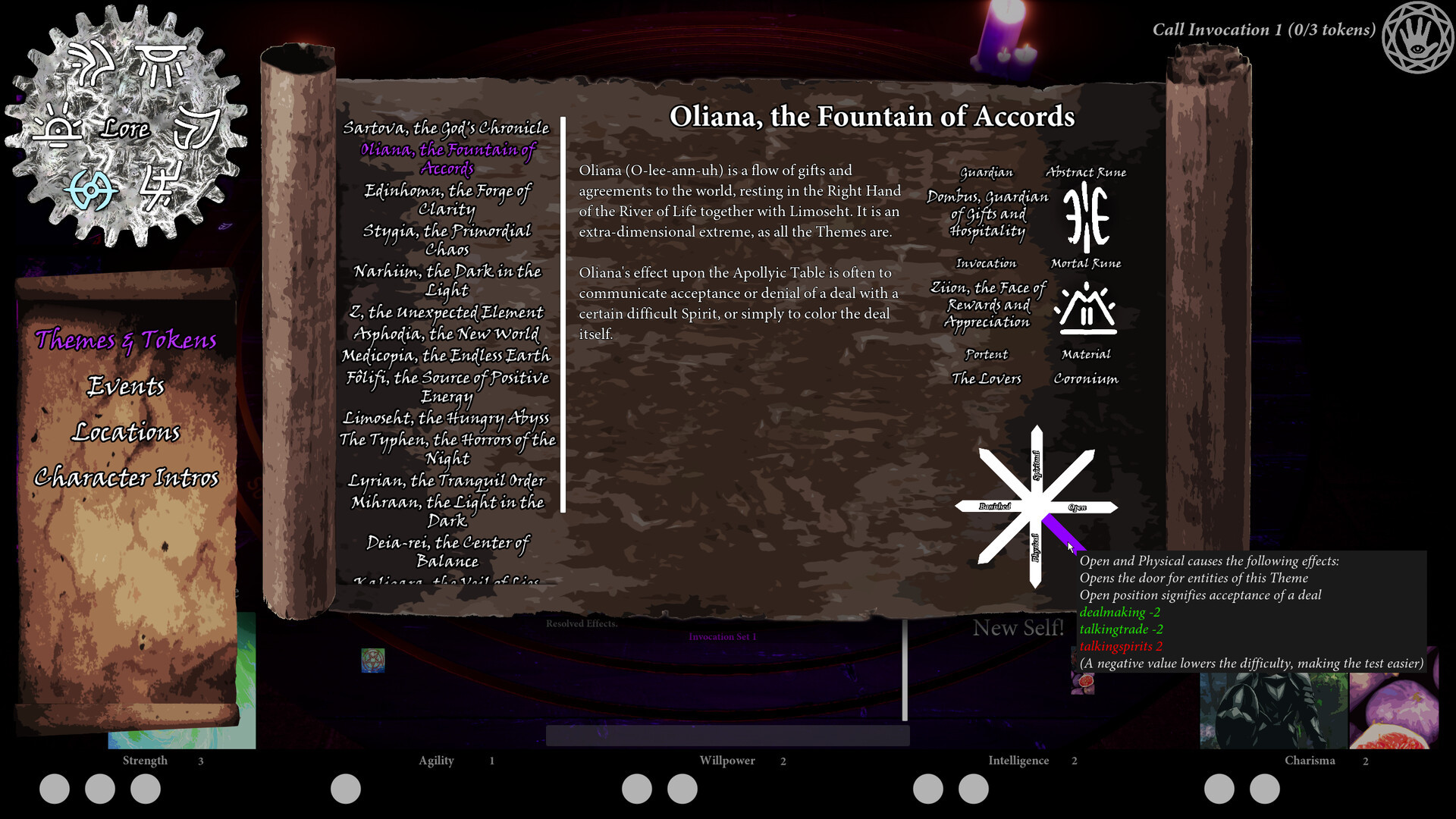 One will utilize obsidian tokens upon the Apollyic table to control various powers, and where they lie upon the table will influence the power in that direction, summoning or banishing spirits who favor said power. You can also invoke spirits of your own, some of which you may bring between rituals, as well as other items to aide in the ritual, such as the Chronometer to keep time sane while projecting into the spirit world, or a brave ally who can aide you during the ritual.