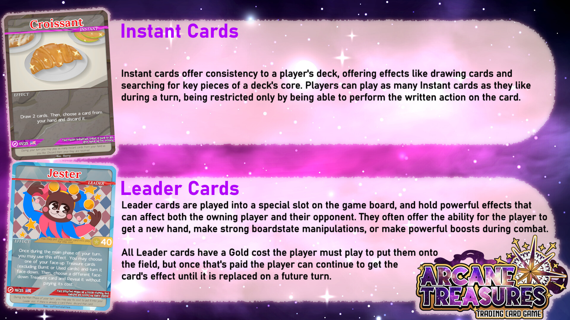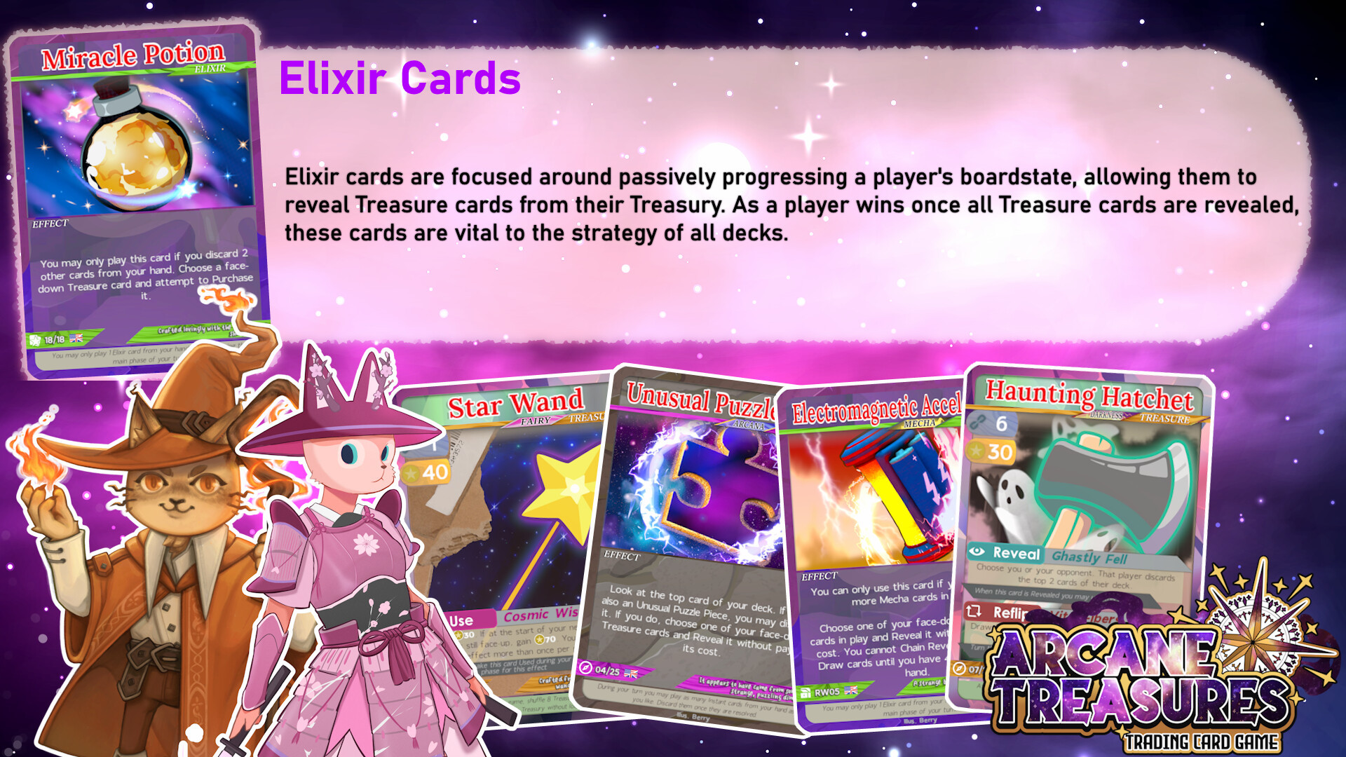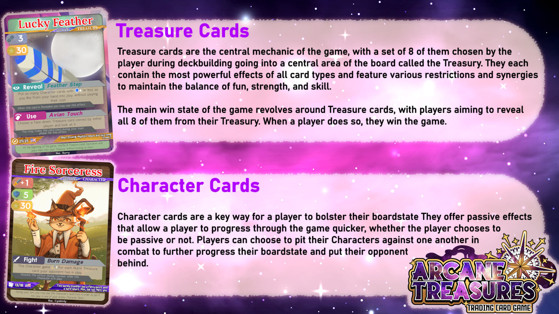 Supporting small indie artists, Arcane Treasures: Trading Card Game brings players to a cute & whimsical fantasy world where rivalling factions of animal characters fight to uncover fantastical riches!