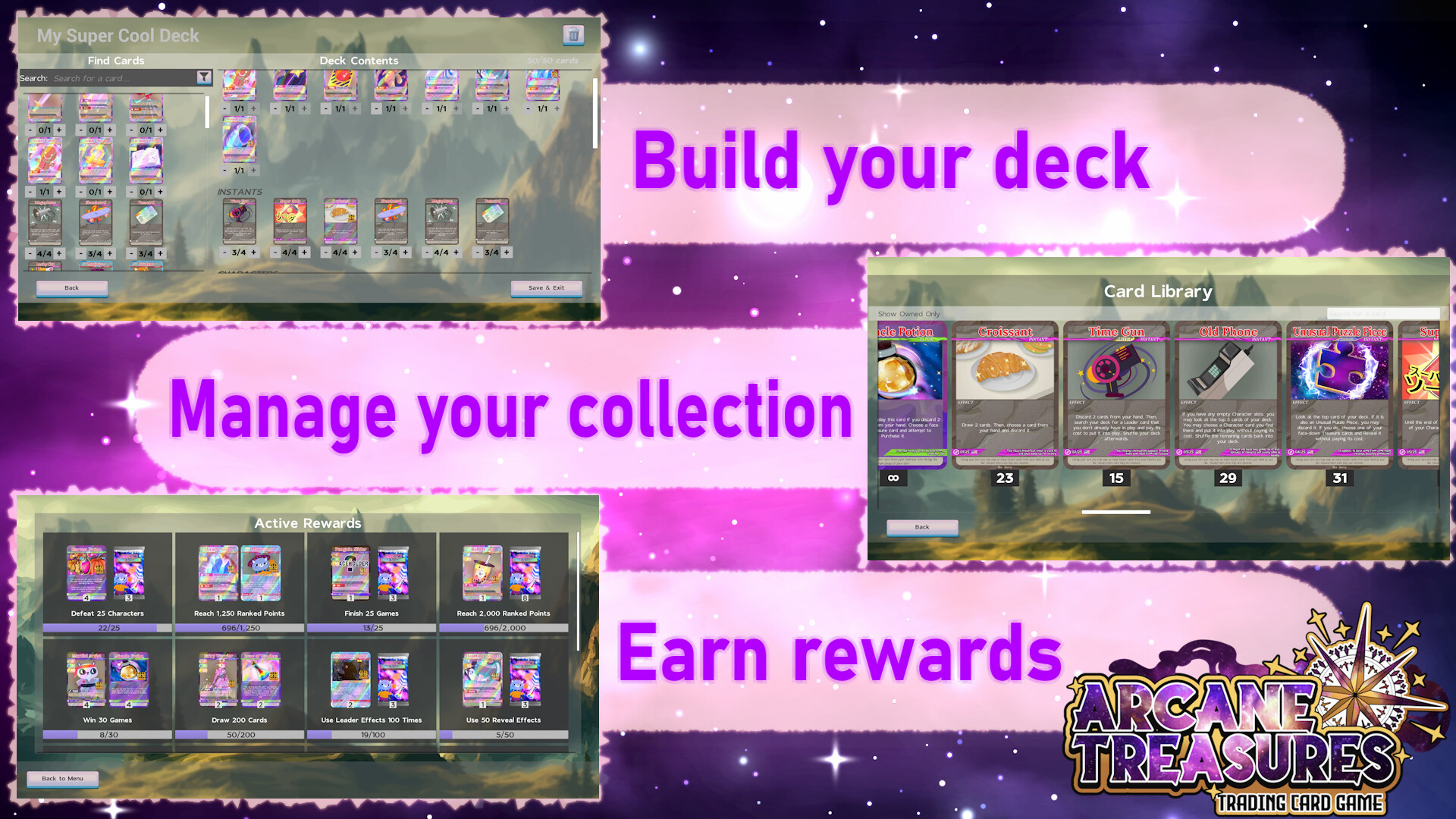 Show off cards you pull from booster packs or earn through challenges to your friends! AT:TCG uses the Steam Inventory service to manage the cards you own, meaning your collection is in safe hands!
