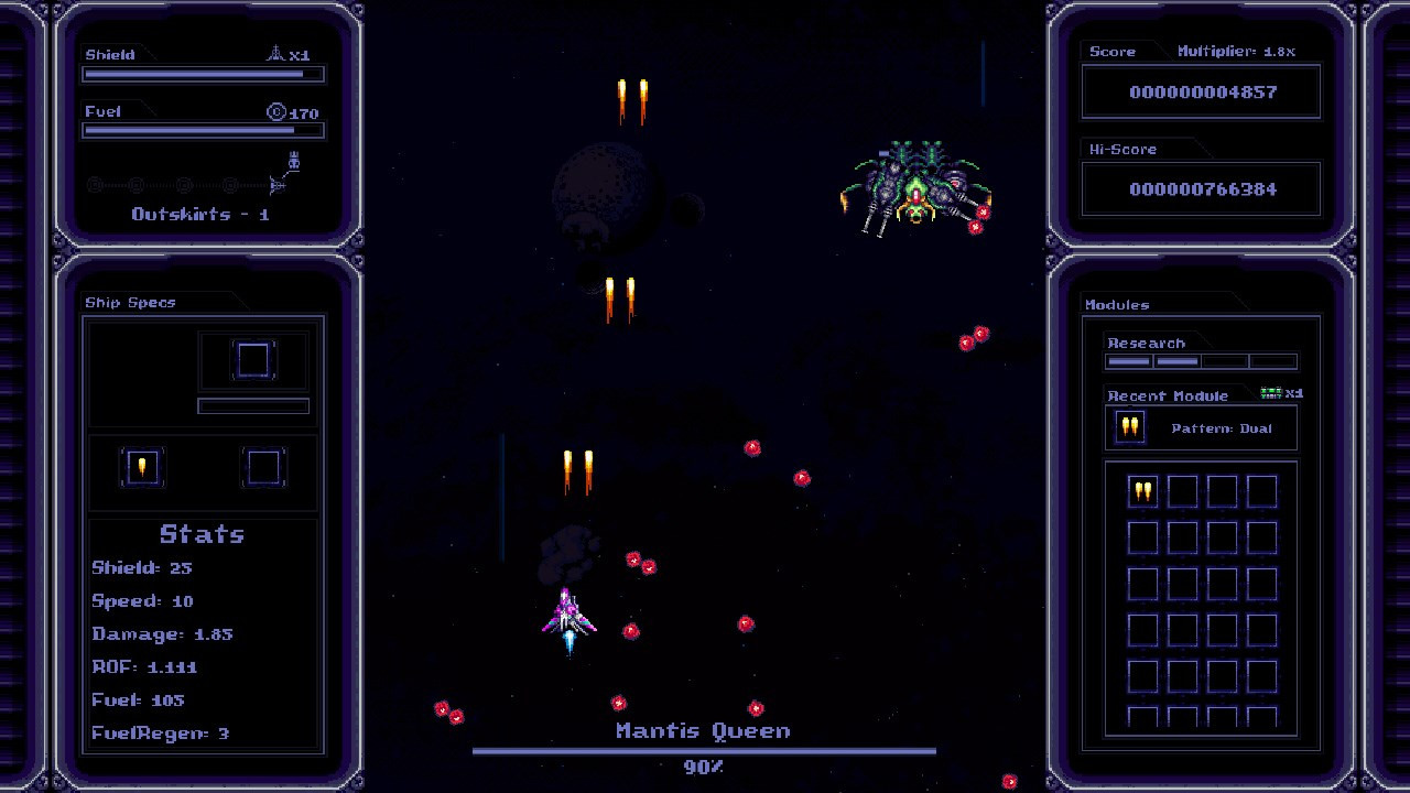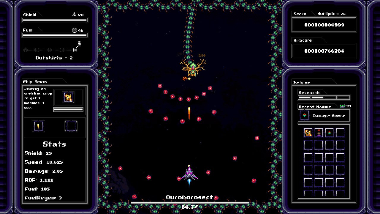 Projectile Modifiers or Drone Companions. Most of the Upgrade modules will combine with eachother to create unique combos. There are a ton of combo possibilities so don't be afraid to experiment!Research SystemThe Research System will allow you to further power up your ship before each playthrough. Research points are obtained through picking up Modules of any kind and may be spent on any of the 3 available Research Trees: Offense, Defense and Utility.Seed SystemEach playthrough will have a unique string identifier that determines the generated content. Share this seed with your friends so they can experience the same crazy combos and hardships that you did!