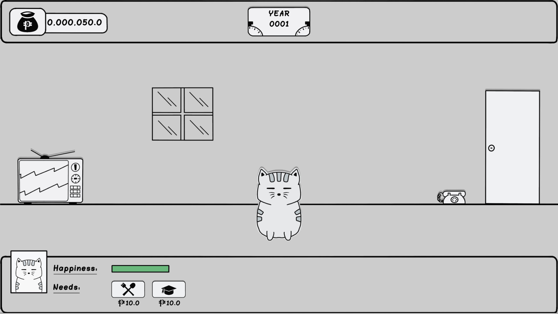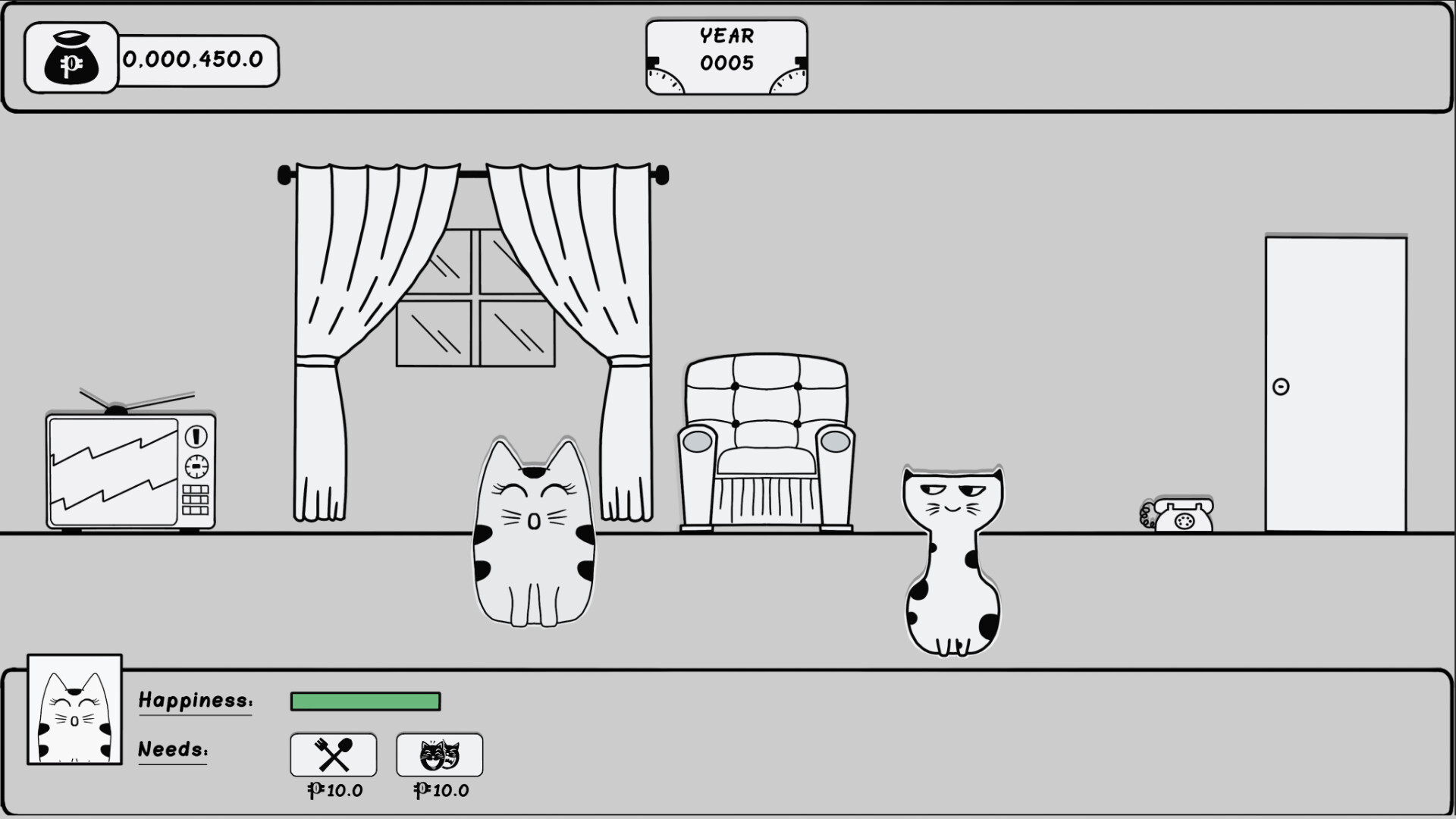 Cat's Vote is a resource management and decision-making simulation where every choice counts. As the head of a feline household, you must ensure your family's happiness by meeting their needs—whether it's electricity/water bills, food, or entertainment. But there's a twist: the price of resources fluctuates based on the decisions of a cat government, and you get to cast your vote in the elections!