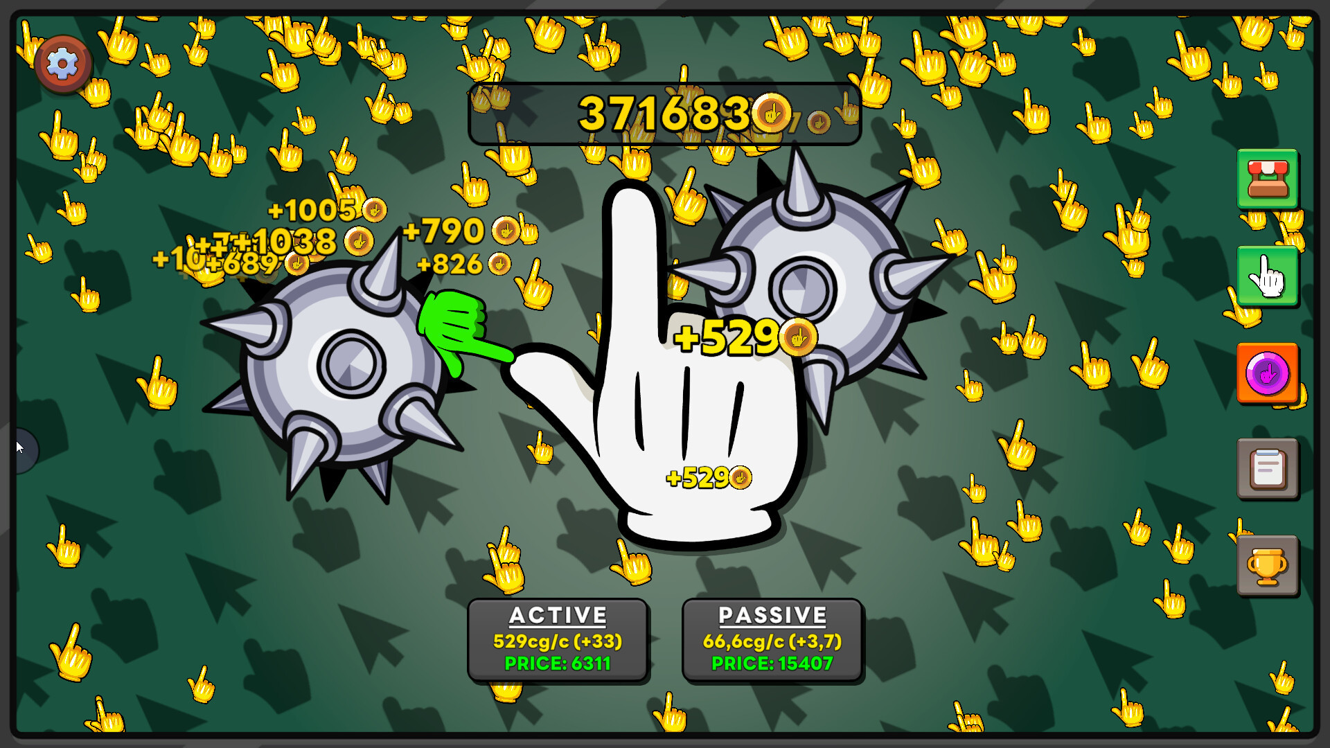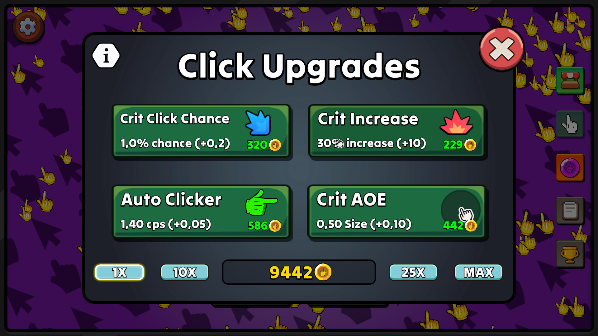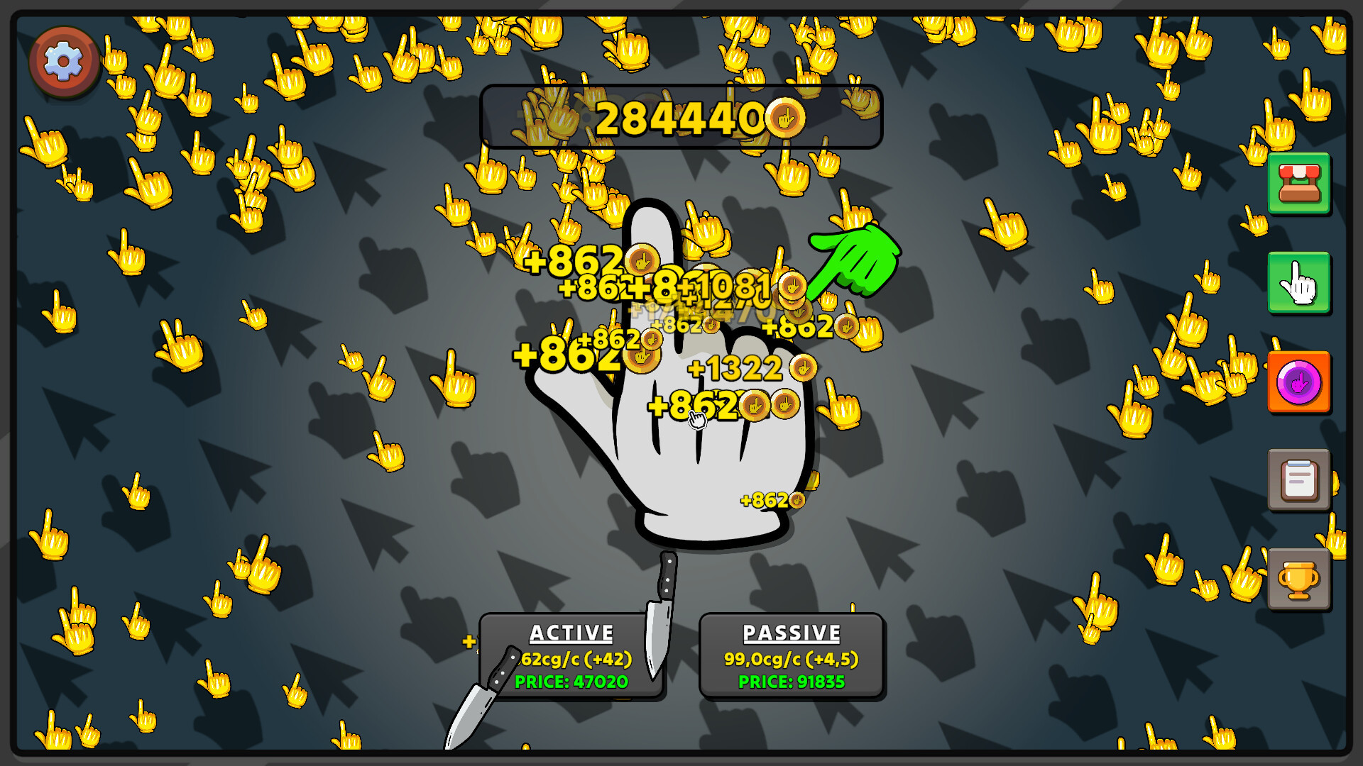 As you click on the main cursor, golden falling cursor will begin to spawn. Their spawn rate is based on the progress you make by clicking. Clicking on these falling cursors will reward you with click gold that is more than the click gold received by active clicking.