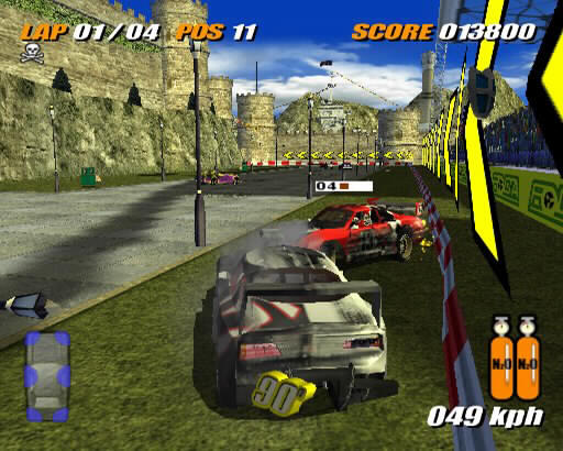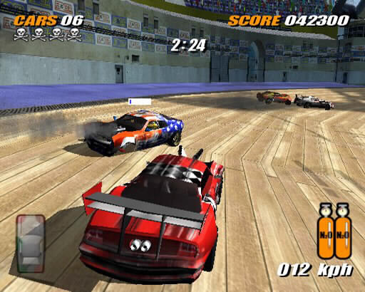 Taking the game out across the electronic ether via a PS2 Network Adaptor and a broadband connection, you can share the pain with 19 other death-dealing drivers. The quick-fix race of Wrecking Racing and vehicular violence of Destruction Bowl return for online play as well as three exclusive game modes. For those of you who want to recreate the pure racing thrills of Days of Thunder, the Speedway mode rewards drivers for their position past the chequered flag. You can still smash into your opponents, but the damage to your car and unpredictability of hi-speed collisions may strip you of an all-important podium position. Capture the Trophy mode challenges you to grab and hold onto the trophy - keep it long enough and you'll win, but you're unlikely to survive that long. On the flip side, you have Pass the Bomb, where the last thing you want to do is hold on to it for too long. You'd better ram someone soon to pass on your explosive gift.