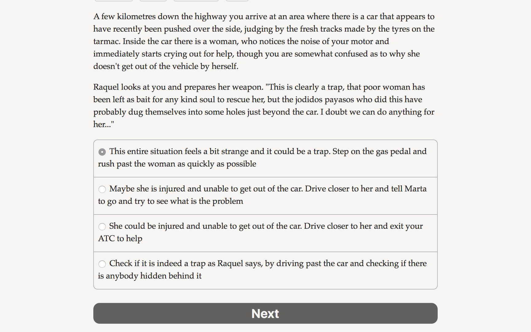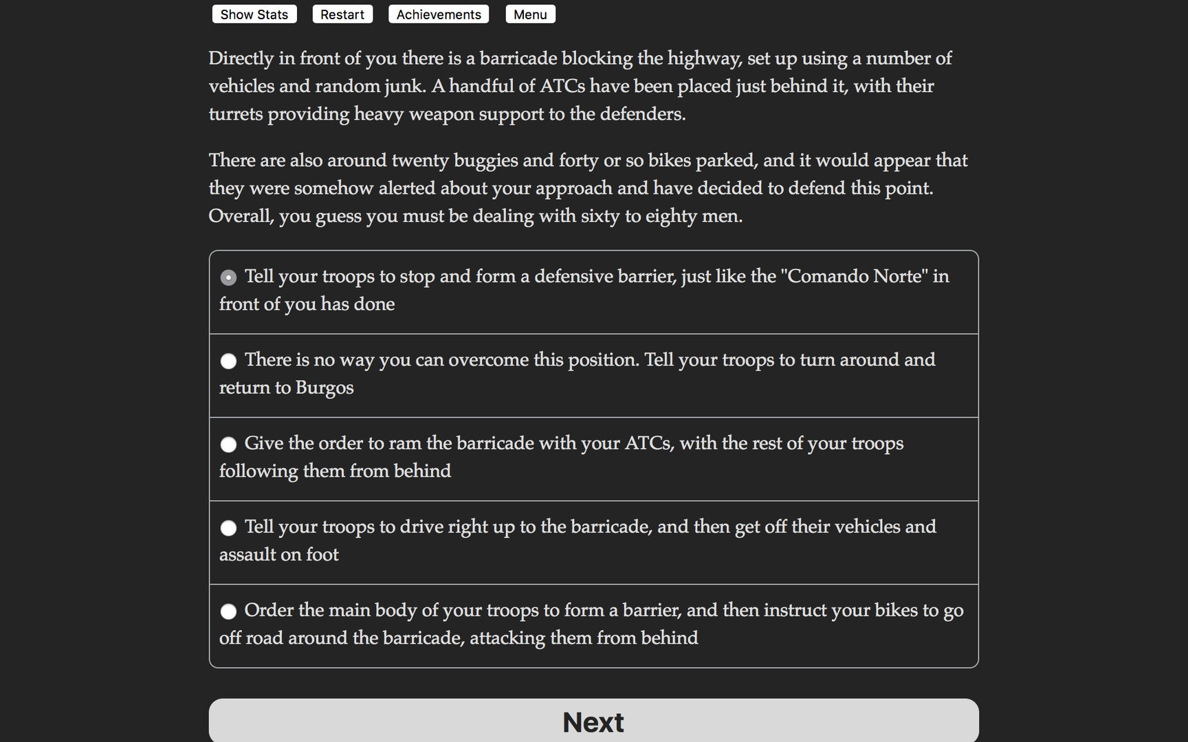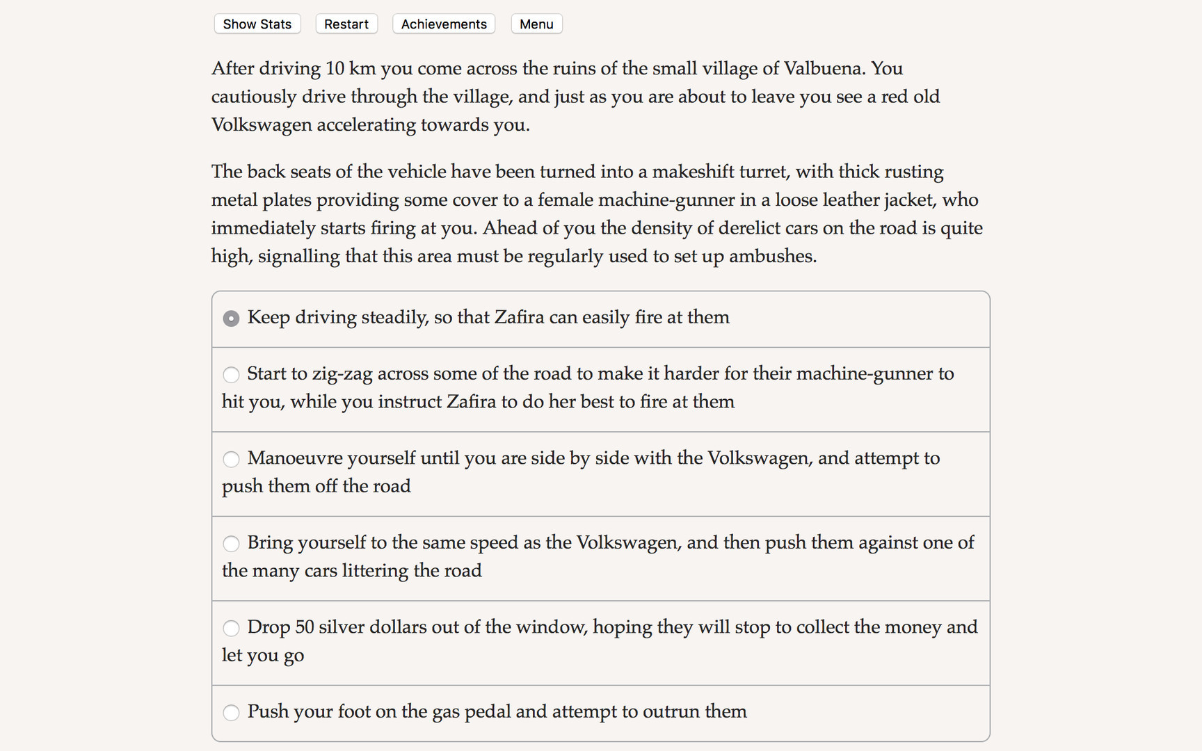 Highway Wars is a 230,000 word interactive post-apocalyptic novel by Adrao, where your choices control the story. It's entirely text-based—without graphics or sound effects—and fueled by the vast, unstoppable power of your imagination.