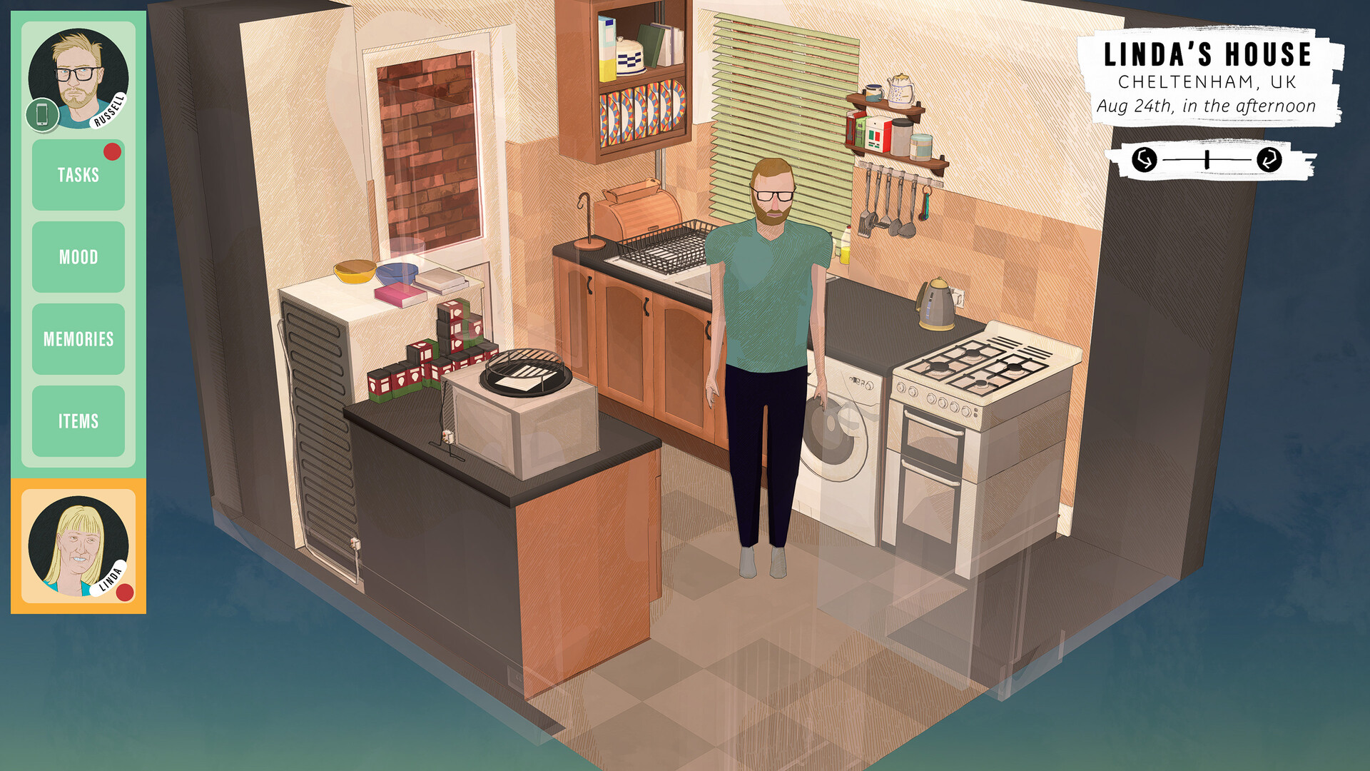 Players experience the events from the perspectives of Russell, Linda, and Joan through exploration, conversation, and tasks designed to give emotional insight into the themes of caregiving, dying, bereavement, and homeland.