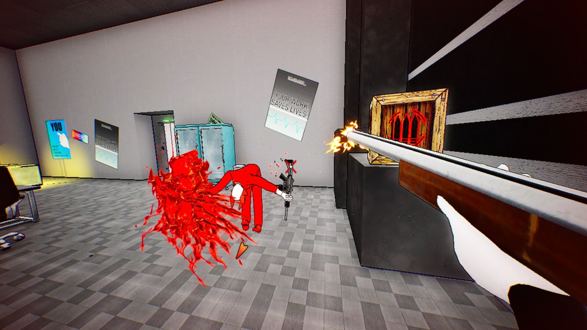 No ammo? No Problem! Everything is a bullet if you throw it hard enough. When your gun runs dry, there's another one waiting for you in the arms of the nearest enemy. Weave in and out of combat, juggling the security team's whole arsenal in the process. With over 15 guns to pick up, ranging from pistols to snipers and rifles to grenade launchers, you'll always be able to pack a punch. If you ever find yourself without a weapon, just "convince" the nearest employee to lend you theirs with a swift kick to the mouth.