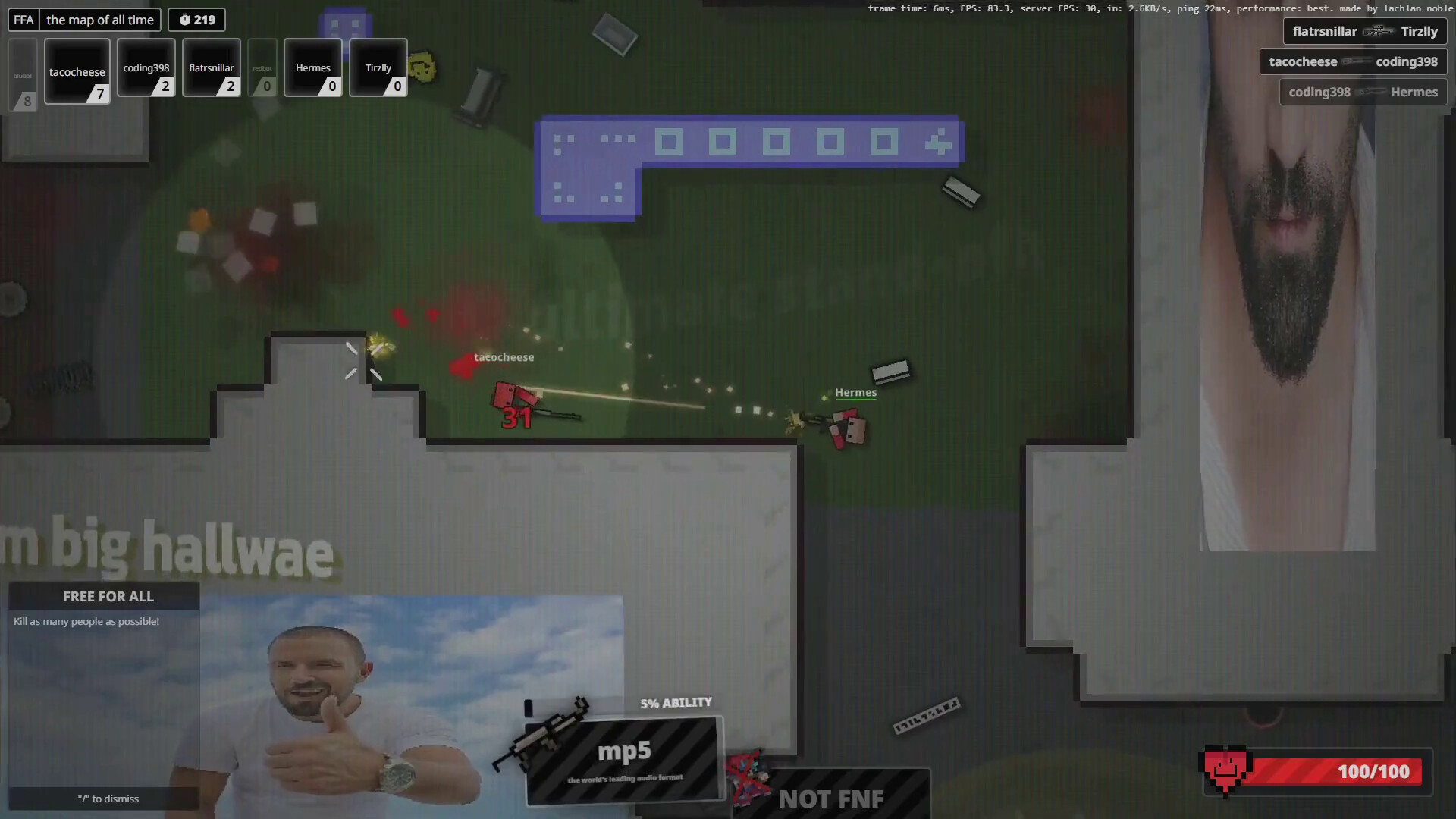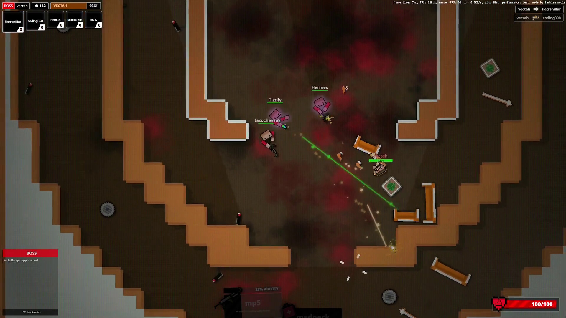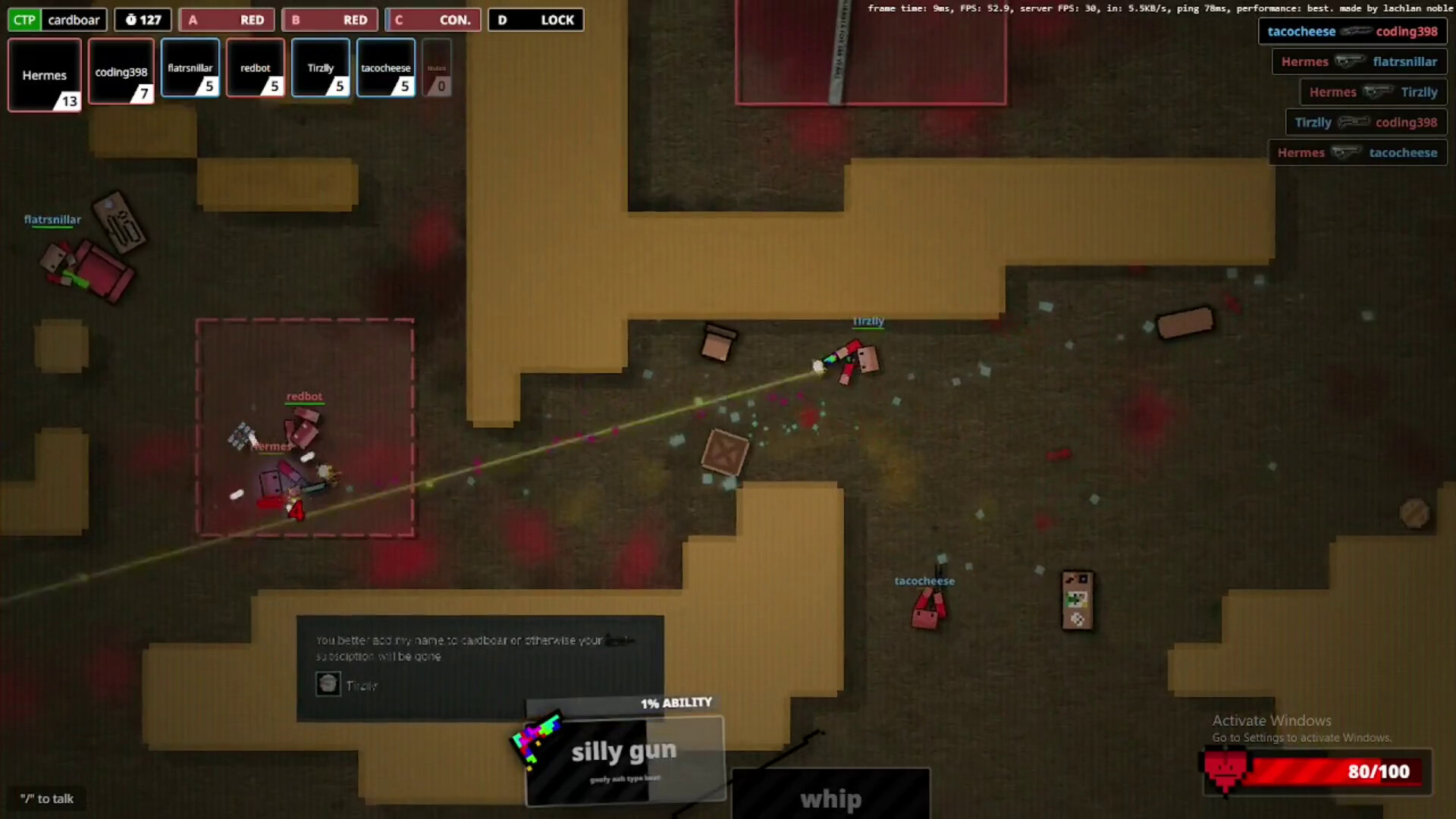 Shenaniguns is a top-down, real time multiplayer shooter. Each time you spawn, you get 2-3 weapons (depending on the gamemode) to battle your friends!