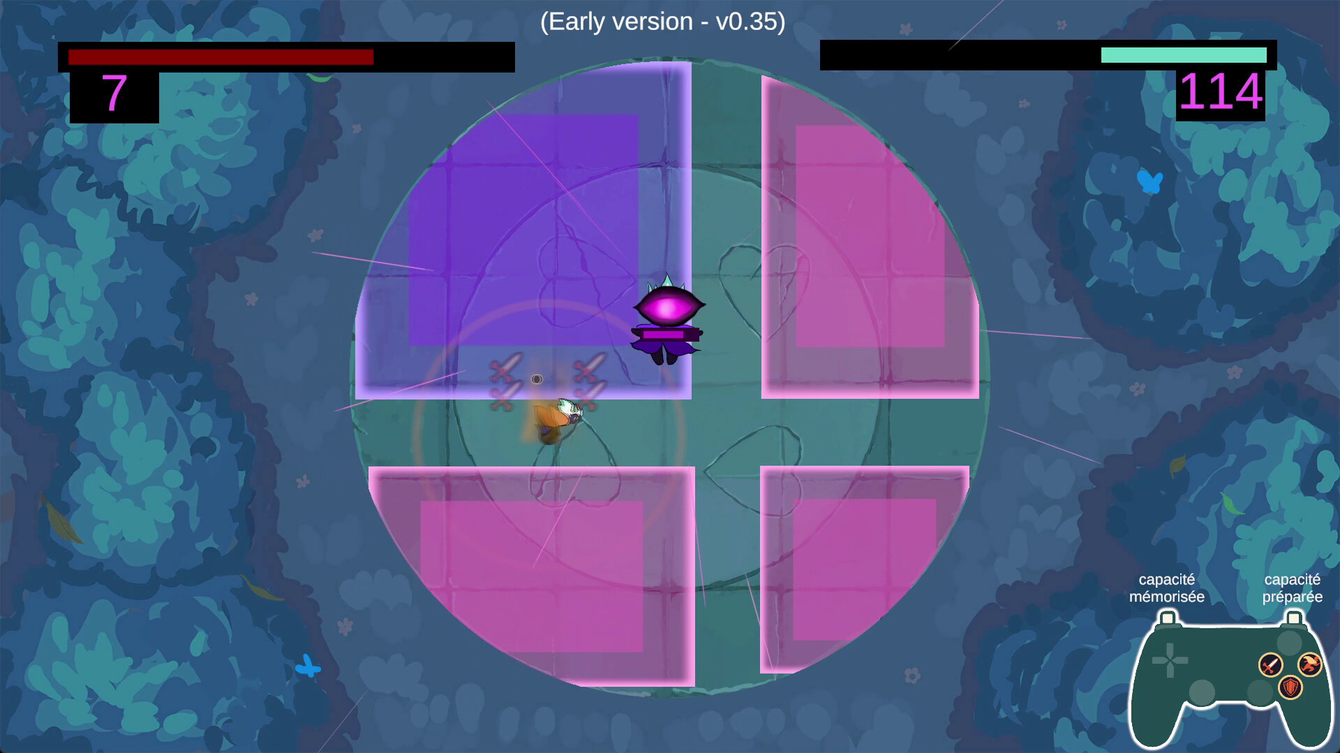 Siaty wields the 3 Facets of destruction, resilience and movement. In battle, these Facets can either be used separately or merged to create a wide variety of abilities. Long range attack, close range attack, dash forward, backdash, protective shield, teleportation, timed defense, ... Master Siaty's versatility and find your way to overcome whatever is in front of you.