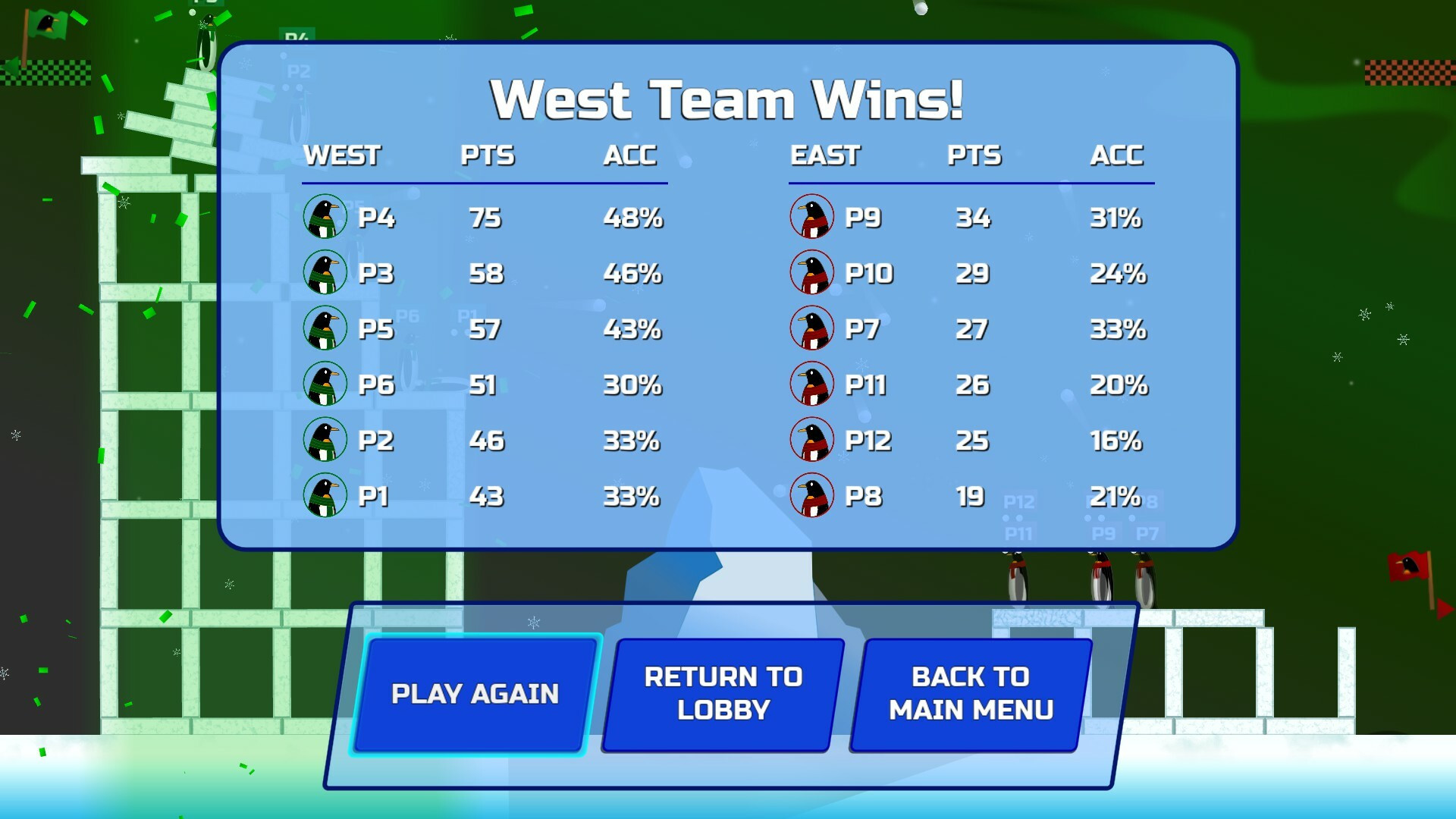Gather up to 12 friends, family, or rivals for a fast-paced snowball showdown! Pick your penguin team, West or East, and face off to determine the champions of the ice!