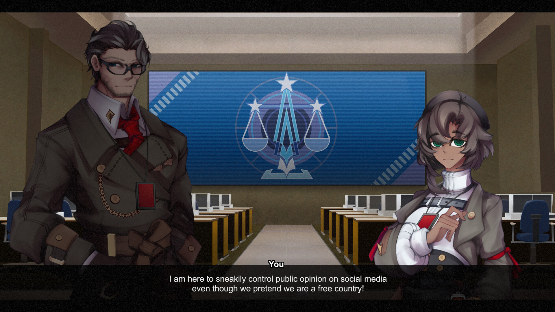 The game will then switch sides and put you in the Federation of the Free's Social Intelligence Task Force, where you will fight against what you were promoting. Through a list of news items that covers a range of political and social matters, you will alternately promote two opposing viewpoints.