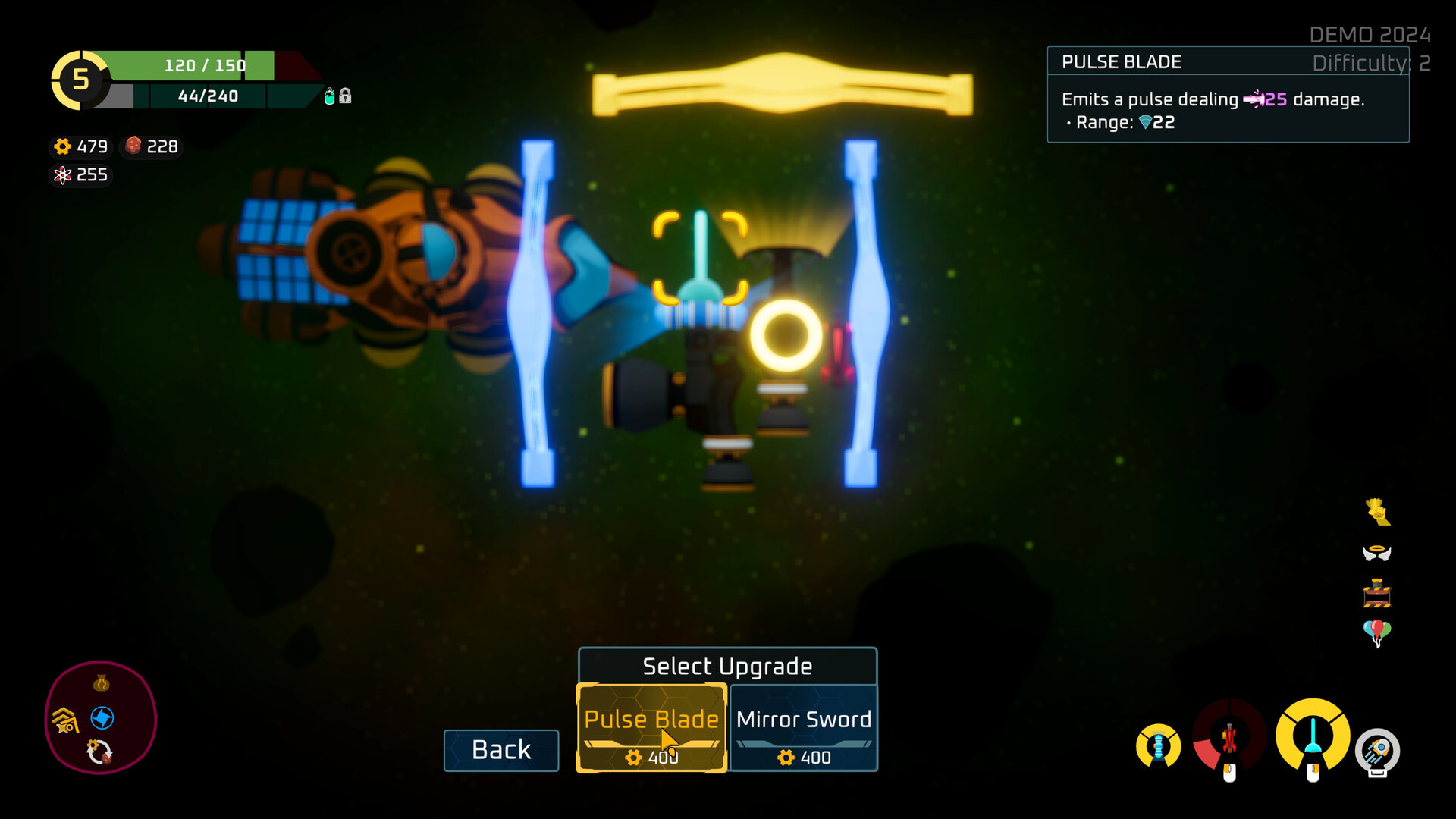 In addition to attaching new modules, Space Scavenger also has Gadgets. These are upgrades that last for the rest of the run and will really define your playstyle. Upgrades such as increased projectile range, larger Area of Effect sizes, increased resistance, improved agility and much more.