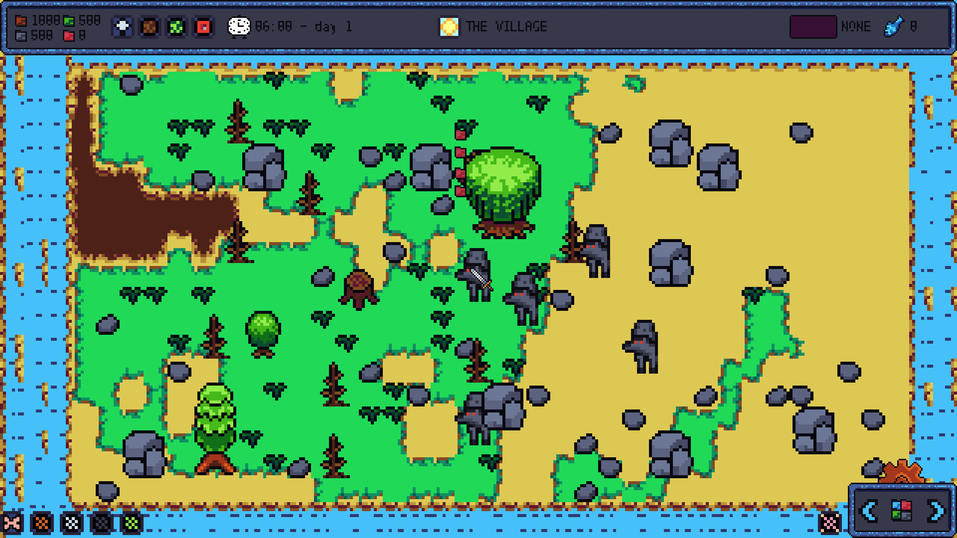 The game features a random map system, including the generation of various types of trees, rocks, bushes, and animals with each new game, each with its own specific attributes, making every game unique.