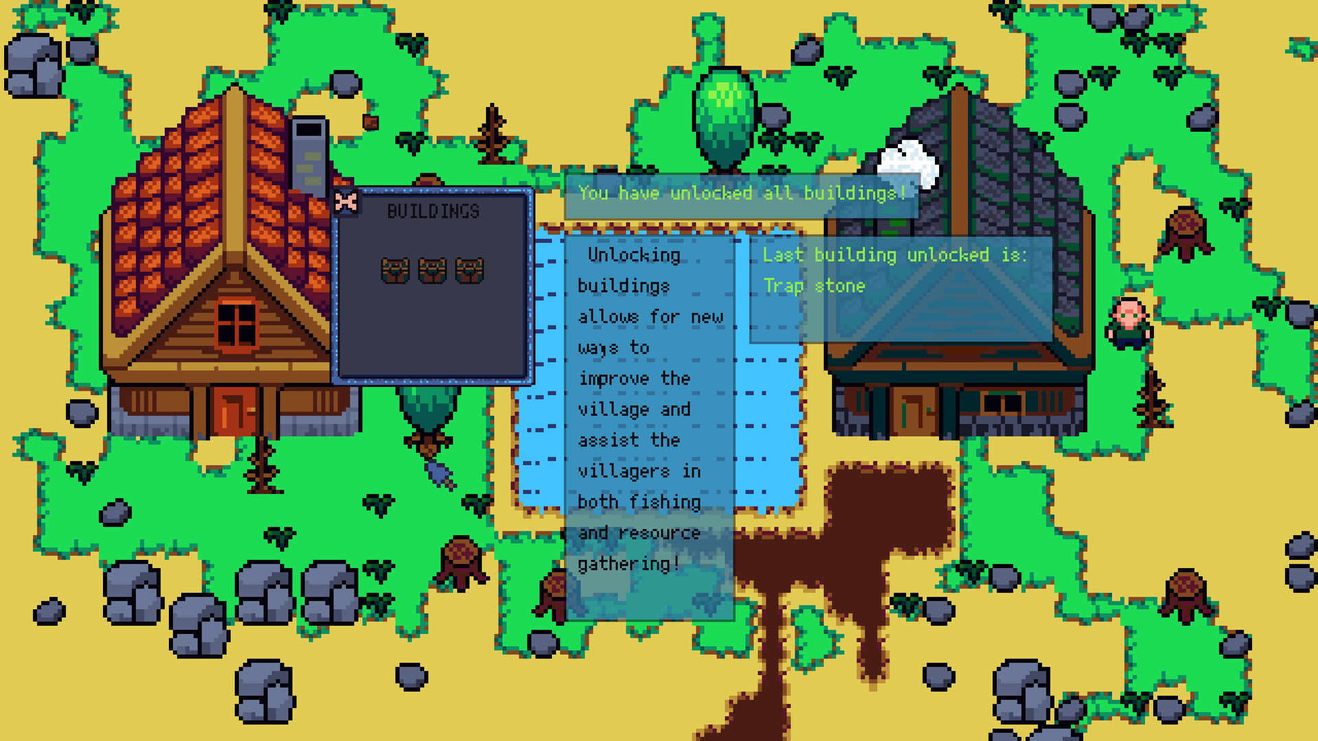There are various types of buildings available in the game, from houses, fishing traps, fences, and plantations to different types of flooring.