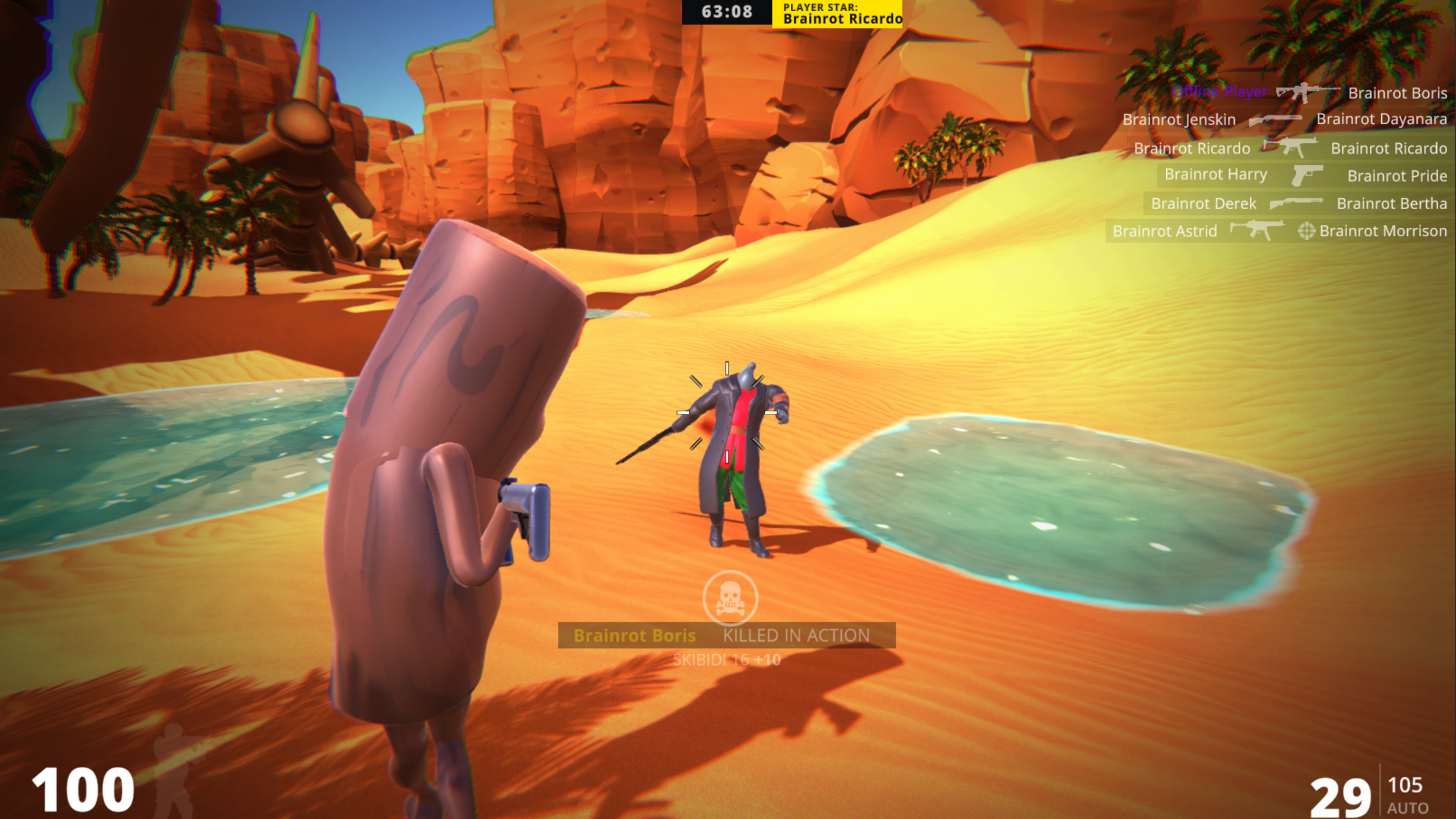 Tralaleo Tralala: Battle Royale is an exciting, fast-paced Battle Royale shooter, where players face off against colorful enemies: Tralaleo Tralala, Bombbardini Crocodilo, Bombbardini Guzini, and the cunning Bobrito Bandito. The action unfolds on a large, open map featuring vibrant locations ranging from dense jungles to desert valleys.