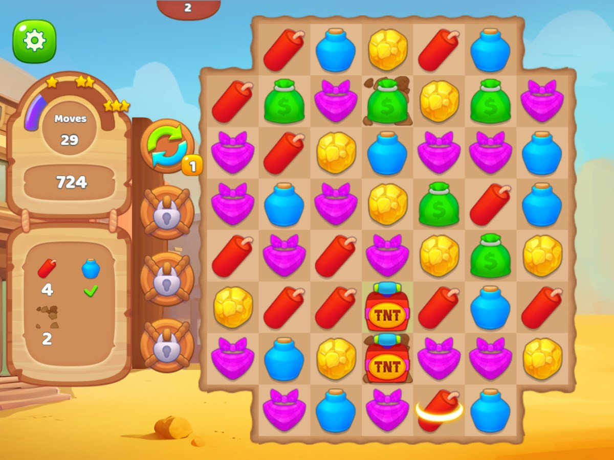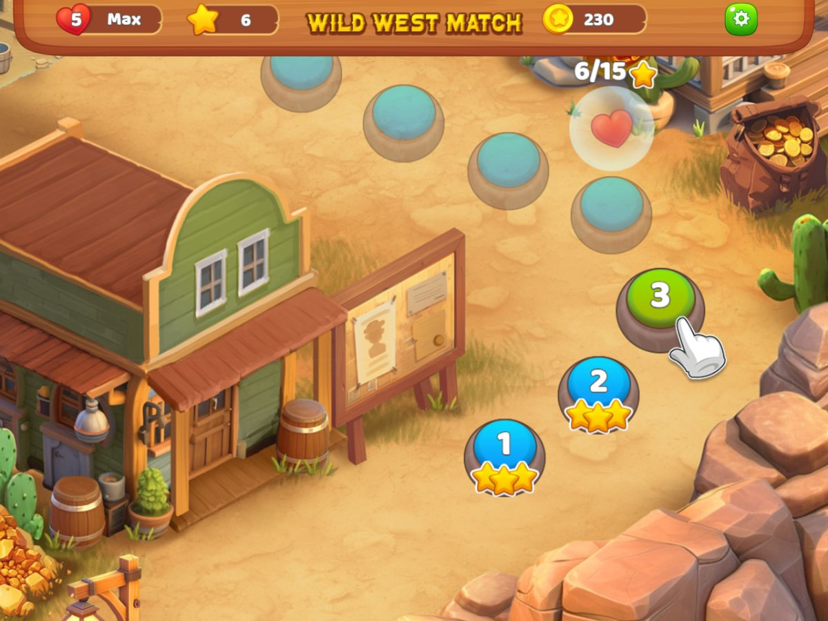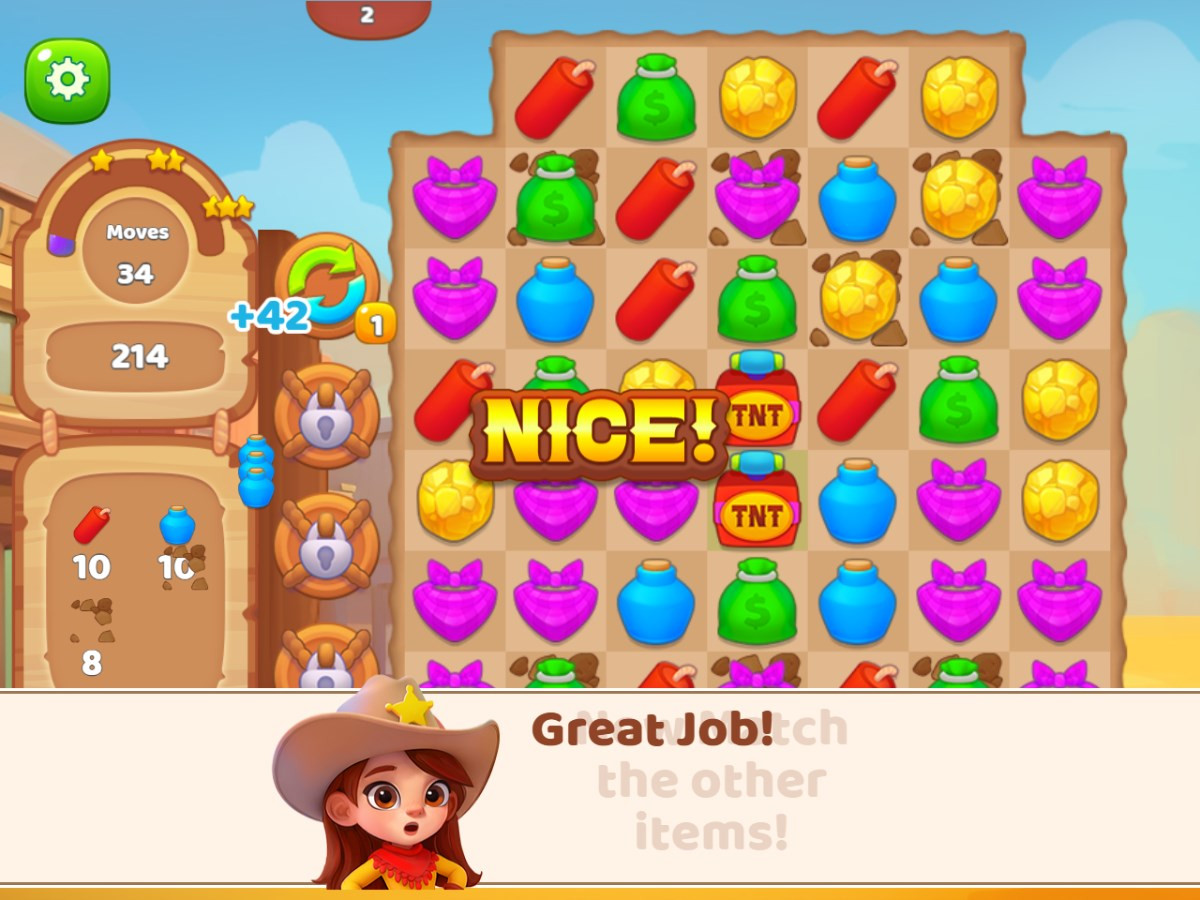 Wild West Match 2 immerses you in the thrilling Gold Rush era of the Wild West! Match three or more gold nuggets, cowboy hats, horseshoes, and other treasures to earn points and unlock new levels. Use Dynamite to clear obstacles or reveal hidden gold! With hundreds of challenging levels, you’ll dig through the Wild West to find hidden treasures and secrets. Ready to strike it rich? Join the Gold Rush adventure now!